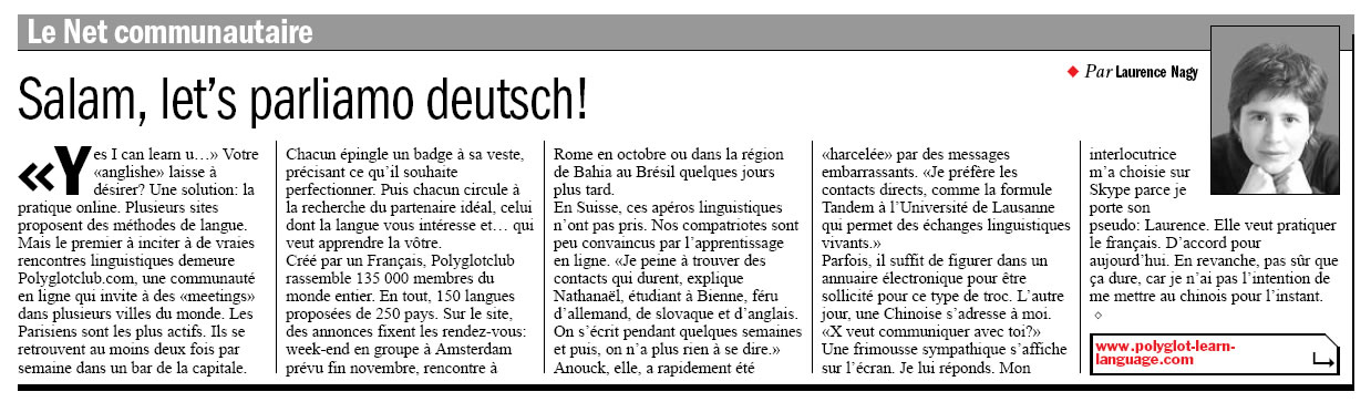Plusieurs sites proposent des méthodes de langue. Mais le premier à inciter à de vraies rencontres linguistiques demeure Polyglotclub.com, une communauté en ligne qui invite à des «meetings» dans plusieurs villes du monde. Les Parisiens sont les plus actifs. Ils se retrouvent au moins deux fois par semaine dans un bar de la capitale.Lisez l'article ! -